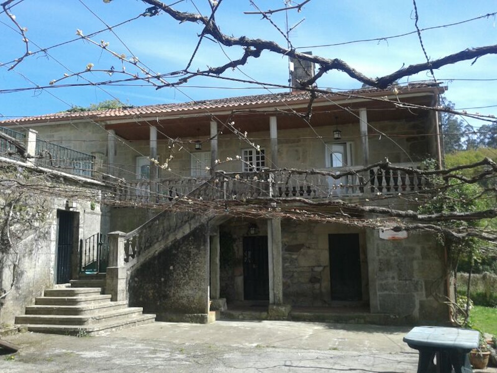Una fachada de una antigua casa de labranza del siglo XVIII situada en Cuntis (Pontevedra) coronada con una gran escalera del año 1949 que representa la evolución de las estructuras de hormigón armado en la postguerra.